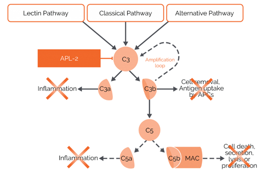 Apellis是第一家研发C3抑制剂的公司 ,其头号在研药物APL2是补体分子C3抑制剂,用于治疗如年龄相关性黄斑变性(AMD),自身免疫性溶血性贫血(AIHA)等自身免疫性疾病。该抑制剂旨在减少补体过度激活带来的自身免疫性损伤,从而治疗补体系统介导的多种自身免疫疾病。其在广泛的医学领域有潜在的应用,包括血液学、肾脏病学、神经病学和眼科。
