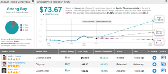 综合以上因素,高盛予Apellis“买入”评级,目标价130美元,意味着在未来12个月内其股价较当前水平存在183%的上行空间。基于7个买入评级,1个持有评级,Apellis的华尔街共识评级为“强烈买入”,平均目标价为73.67美元。