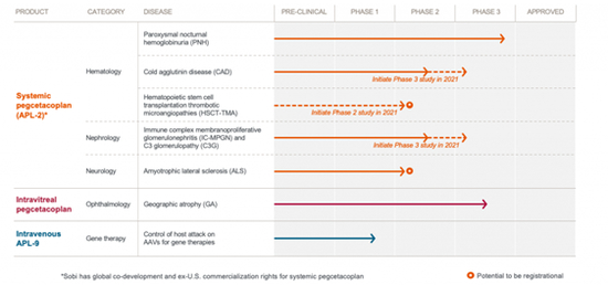 Pegcetacoplan用于PNH和地理萎缩(GA)被美国食品和药物管理局(FDA)授予“快速通道审评”称号,并正在接受欧洲药品管理局(EMA)的审查。另外,Ppegcetacoplan的其他应用中,与GA相关的三期研究正在进行中,预计将在今年第三季度得出结果。