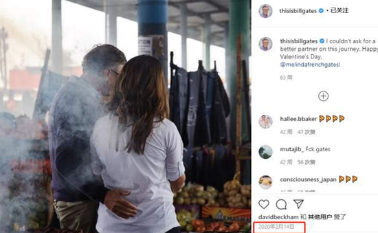 2月14日情人节,两人在一起逛水果市场时,比尔盖茨分享了一张抱着梅琳达的照片,并配文说道: