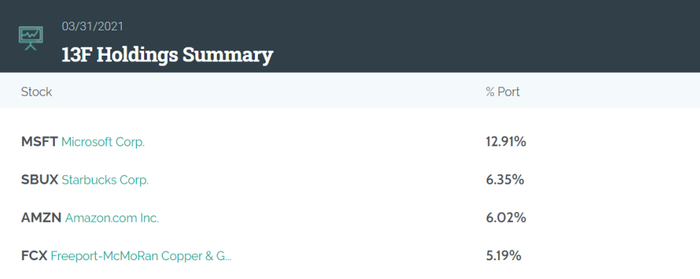 目前Duquesne的第一大持仓股是微软公司,份额占比12.91%。第二、第三和第四大分别是星巴克、亚马逊和自由港铜矿集团。