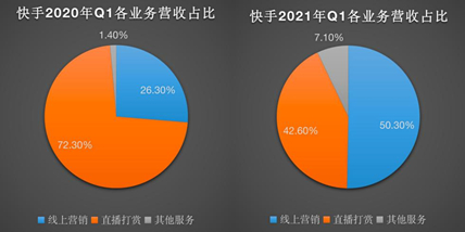 其实,自2019年以来,快手的线上营销收入占比就在不断扩大,直播打赏收入持续减少。2021年第一季度,线上营销收入为86亿元,同比增长162%,但是直播打赏收入同比下降19.5%至73亿元,相比2020年四季度的79亿元环比下降8.2%,这是直播收入继上季度同比下降7.1%之后,再次出现下降。