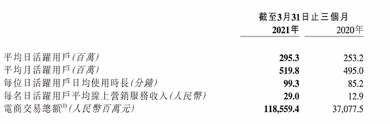 2021年第一季度,快手中国应用程序及小程序的平均日活跃用户达3.792亿,同比增长26.4%。快手应用平均月活跃用户分别为5.198亿,每位日活跃用户的日均使用时长为99.3分钟,同比增长16.5%,环比增长10.5%。