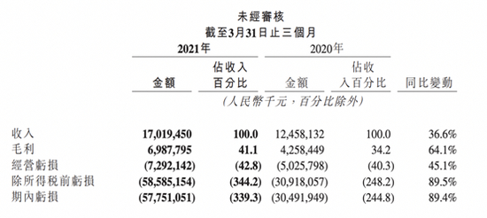 财报显示,2021年第一季度,快手总收入为170亿元,同比增长36.6%。2021年第一季度净亏损577.5亿元,调整后净亏损49.2亿元。毛利率由2020年同期的34.2%提升至2021年第一季度的41.1%。