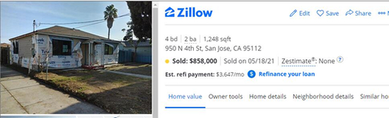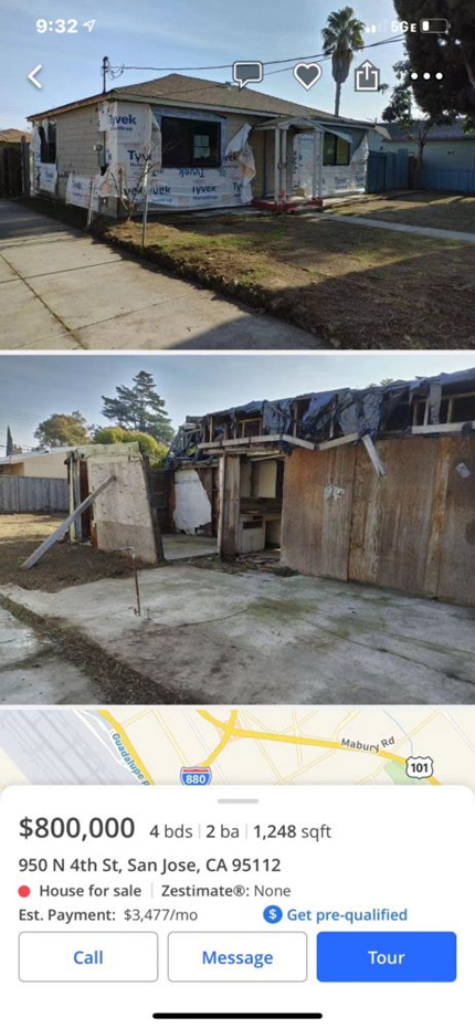 圣何塞地区一栋破旧的房屋以80万美元在今年年初上市,在5月18日以85.8万美元的价格售出,不到半年的时间涨价5.8万美元(约合37万人民币)。图一:挂牌价;图二:房地产网zillow显示该房已售出。