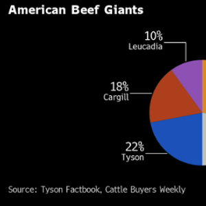 根据泰森食品公司的一份投资者报告,以美国牛肉加工产能的最高值计算,JBS第一,占23%;泰森占22%。JBS约占美国猪肉产能的五分之一。