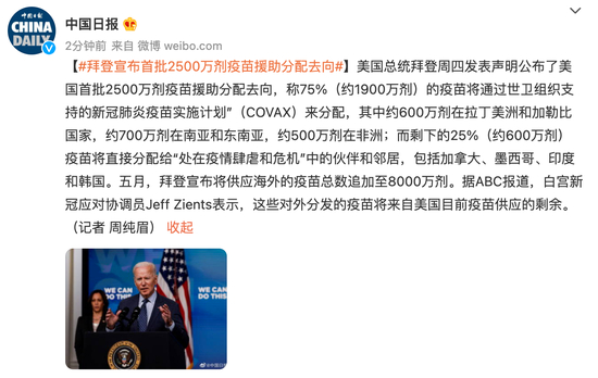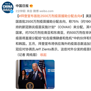 【#拜登宣布首批2500万剂疫苗援助分配去向#】美国总统拜登周四发表声明公布了美国首批2500万剂疫苗援助分配去向,称75%(约1900万剂)的疫苗将通过世卫组织支持的新冠肺炎疫苗实施计划”(COVAX)来分配,其中约600万剂在拉丁美洲和加勒比国家,约700万剂在南亚和东南亚,约500万剂在非洲;而剩下的25%(约600万剂)疫苗将直接分配给“处在疫情肆虐和危机”中的伙伴和邻居,包括加拿大、墨西哥、印度和韩国。五月,拜登宣布将供应海外的疫苗总数追加至8000万剂。据ABC报道,白宫新冠应对协调员Jeff Zients表示,这些对外分发的疫苗将来自美国目前疫苗供应的剩余。(记者 周纯眉)