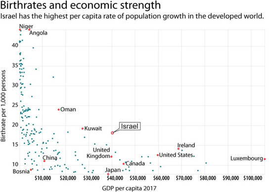 上图是2017年世界各国生育率和人均GDP的对比,横纵代表人均GDP(GDP per capita),纵轴代表每千人出生率。在所有的人均GDP超过4万美元的国家中,只有以色列的每千人出生率为18人。加拿大仅为11人,美国为13人,卢森堡为12人。