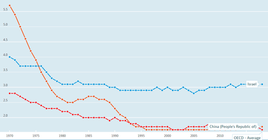 从1970年代以来,全世界几乎所有发达国家的总和生育率都在下降,甚至是发展中国家都在下降,但是以色列却是特立独行,走出一条与与其他国家完全不同的曲线。