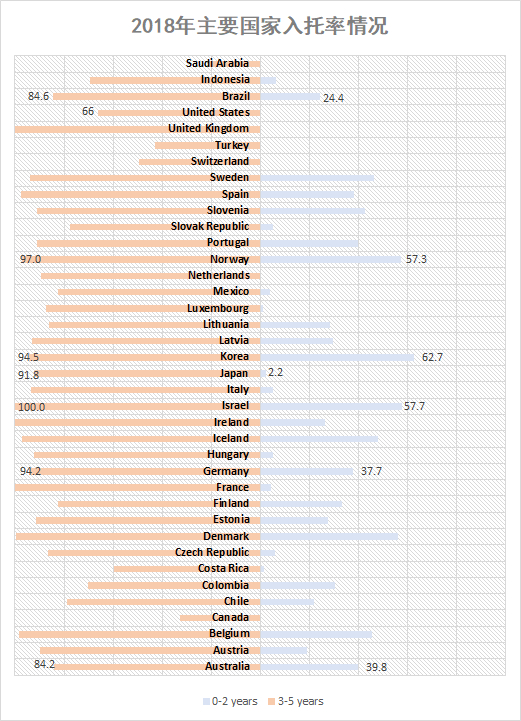 不只是中小学在校时长高于一般国家,以色列对幼儿的照顾也是领先于大多数国家。OECD的统计数据显示,以色列的0-2岁儿童的入托率为57.7%,远高于一般国家,而3-5岁儿童也是以100%的入园率也是高于大多数国家。