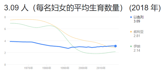 以色列的出生率不仅在发达国家中独树一帜,即便与其相邻国家相比也毫不逊色。如下图所示,2018年以色列的总和生育率是3.09,而它的邻居叙利亚和伊朗在2018年的总和生育率分别是2.14和2.81。从上世纪50年代以来,以色列的总和生育率也在一直下降,但是也只是从将近4下降到2018年的3.09,而同期的叙利亚和伊朗则是从超过7下降到2.81和2.14。