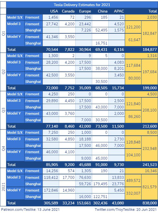 特斯拉忠粉Troy Teslike估计,在第二季度,198000辆的交付量是有可能的(他此前给出的预期值为192000辆),这将支持20万辆的论点——另一个象征性的里程碑。Troy Teslike还预测特斯拉2021年全年将交付83.8万辆。下图是他的预测数据: