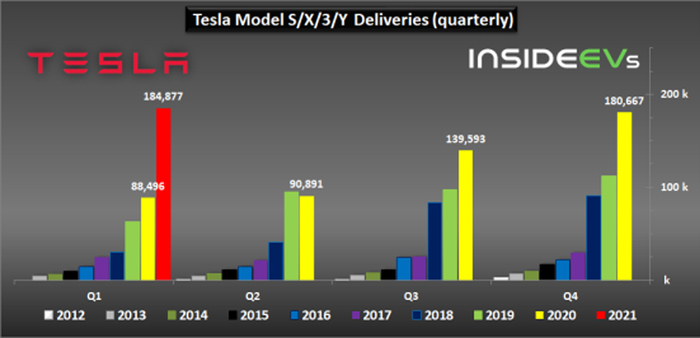 今年第一季度,特斯拉电动汽车的交付量达184800辆,产量达180338辆,双双创下历史新高。据交付数据,第一季度特斯拉生产的所有电动汽车均为Model 3和Model Y车型,价格更为昂贵的Model S和Model X车型的产量为零。同时,第一季度所交付的2020辆Model S和Model X,均来自此前的生产库存,其交付数量仅占该季度总交付量的1%。下图是截至2021年第一季度,特斯拉Model S/X/3/Y交付量: