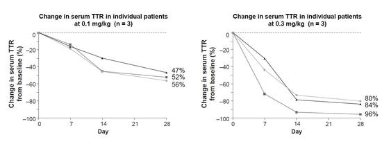 数据显示,接受单剂0.1 mg/kg治疗的患者在28天后TTR水平平均降低52%,而接受单剂0.3 mg/kg治疗的患者TTR平均降低87%,其中一例降低96%。