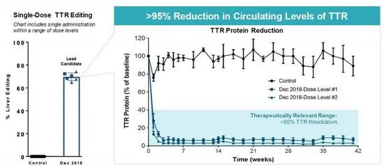实际上,Intellia进一步进行了肝切除术,监测了TTR蛋白的减少,并分析了再生肝脏。该公司发现,再生的肝脏显示了对新生长的肝脏的精确编辑,以及对TTR蛋白的持续敲低。而1期研究结束后,该公司将转向关键研究,从单纯的ATTR多发性神经病变患者扩展到ATTR心肌病患者。