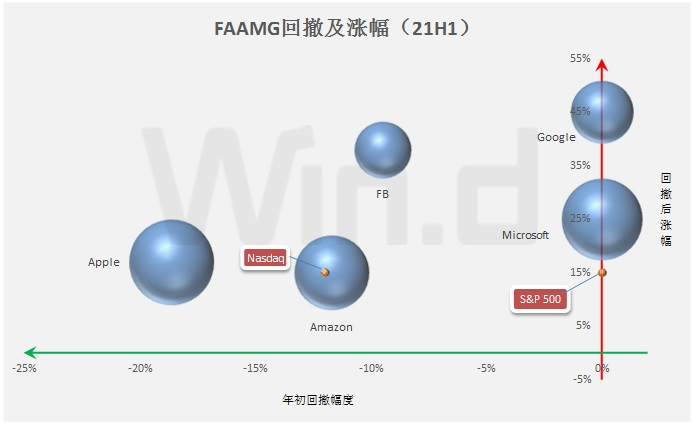 2020年疫情影响,全球大放水,导致今年初,市场一致判断流动性会收紧,导致成长股遭到严重打击,美国五大科技股中,苹果(AAPL.US)回撤幅度最高,短期内跌幅达20%,脸书(FB.US)和亚马逊(AMZN.US)回撤幅度也都超过10%,只有微软(MSFT.US)和谷歌(GOOGL.US)回撤幅度小于5%。
