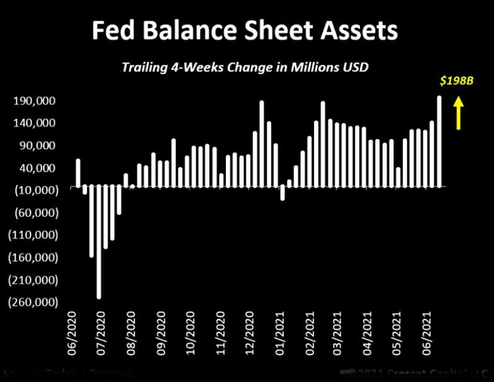 恐慌性杀跌后,美联储一再强调通胀是暂时可控的,近期不会收紧流动性,从资产负债表来看,也确实没有收紧的动作。6月份美联储资产负债表达到创纪录的1980亿美元。流动性继续宽松的背景下,加上前期成长股的大幅杀估值,为后面的全面反攻打下良好基础。