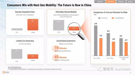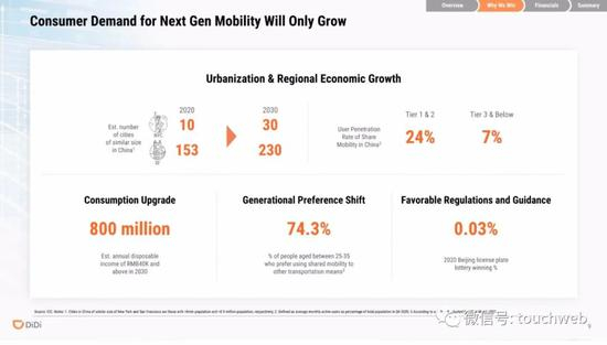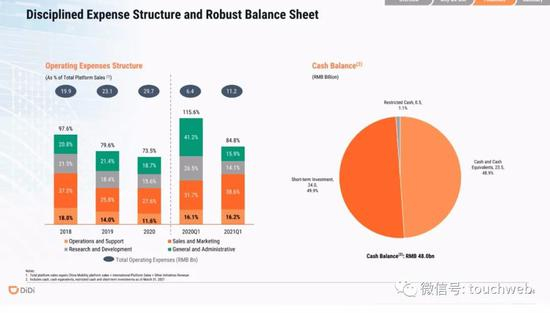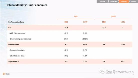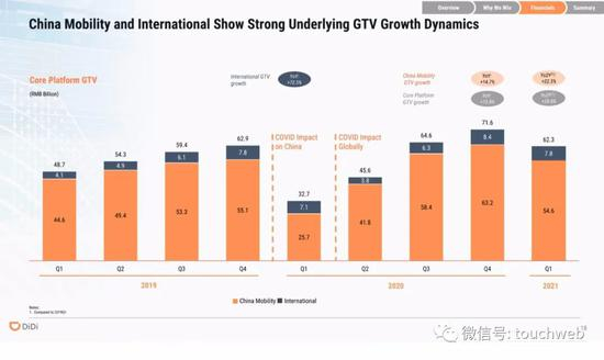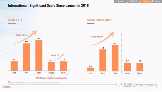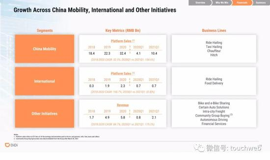 其中,中国出行业务和国际化业务的平台收入从2018年的187亿元,增长到2019年的242亿元,并进一步增长到2020年的347亿元,年均复合增长率为36%。2020年和2021年第一季度的平台收入中,93.4%来自于中国,6.6%来自于国际。