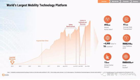 在截至2021年3月31日的12个月里,滴滴全球年活跃用户为4.93亿,全球年活跃司机1500万。其中,自2020年3月31日至2021年3月31日,滴滴在中国拥有3.77亿年活跃用户和1300万年活跃司机。2021年第一季度,滴滴中国出行拥有1.56亿月活用户,中国出行业务日均交易量为2500万次。