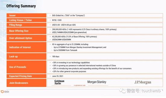 滴滴此次发行2.88亿股ADS,这意味着滴滴此次募资总额达到40亿美元。若承销商完全行使超额配售选择权,滴滴此次募资有望达到46.4亿美元。
