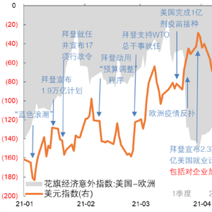 但在2季度,“拜登新政”仿佛后劲不足,美国疫苗接种速度下降,财政计划的推进困难重重,且其中加税计划即便是“结构性”的,也易引发市场对挫伤经济的担忧;而欧洲疫情在封锁后逐步受控,疫苗接种持续提速,宣布发行8000亿欧债等。这些因素令美欧经济预期差出现了显著“反转”,美欧花旗经济意外指数差值走低,美元指数相应走弱(图1)。