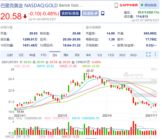 巴里克黄金公司(GOLD)是一家致力于勘探、生产和销售黄金和铜矿的公司,同时也从事矿山开发。2021 年第一季度,巴里克黄金公司(纽约证券交易所代码:GOLD)每股收益为 0.29 美元,超过预期的 0.27 美元,收入为 29.6 亿美元,同比增长 24.02%。该公司的毛利率也为42.66%。