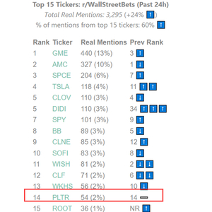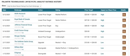 Palantir股票也是WSB散户炒作热门股之一,不过最近热度下降,风平浪静,排名靠后,在14名了。华尔街分析师在5月12日下调了目标价,从23下降到20。