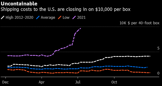 从中国向美国运一箱货物的成本涨到了近1万美元,因全球最大的经济体持续加大进口力度,但同时亚洲和欧洲走出新冠疫情的速度却在放慢。