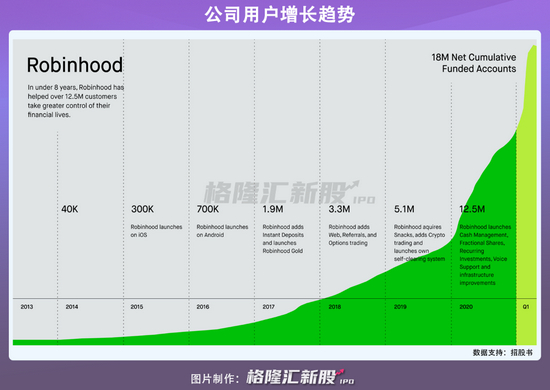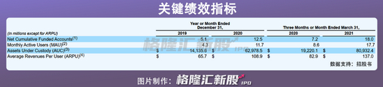 从Robinhood的招股书中得知,截至2021年3月31日,公司累计用户1800万,月活用户1770万。值得注意的是,光2021年第一季度就新增用户550万,看来大家都想在这场散户大战中,大捞一笔。