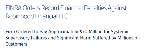 祸不单行,今年6月,美国金融监管局FINRA对Robinhood开出有史以来最大的一次经济处罚——7000万美元罚单。其中5700万美元为罚款,1260万美元为对客户的赔偿金。这笔罚单的一系列问题包括中断交易系统、给客户传达误导性信息及期权交易管控不力等。