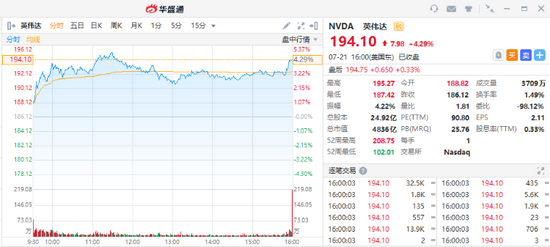 本周二,英伟达正式完成拆股,“一拆四”后当日收盘微跌0.89%。周三持续走高,盘中一度涨超5%,收盘涨4.29%,股价报194.1美元/股,成交71.2亿美元,排第五。受益于半导体和芯片业务繁荣等,英伟达最新市值超过4800亿美元,已跻身美国十大市值公司,加入到苹果及摩根大通等公司阵营。