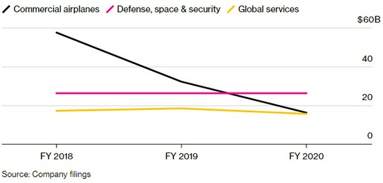 尽管波音第二和第三大部门的收入保持相对稳定,但其商用飞机业务却大幅萎缩。