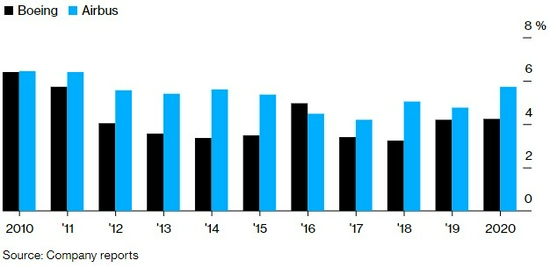 尽管波音在过去10年加大了股票回购力度,但空客每年的研发支出占销售额的比例都超过了波音。空客股价在过去五年上涨了约117%,而波音的涨幅为66%。