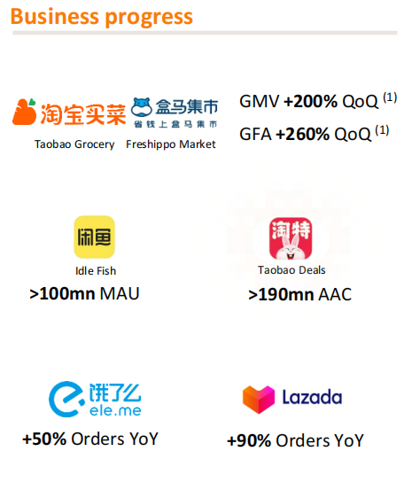 此前阿里财报会议上曾指出构建多个电商APP矩阵是公司未来投入方向之一,本季度来看淘宝特价版、闲鱼等均取得较好进展。