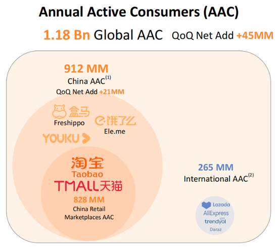 4、截至2021年6月底,阿里巴巴生态体系全球年度活跃消费者达到了11.8亿,较上一季度增加4500万,其中有9.12亿消费者来自中国市场。
