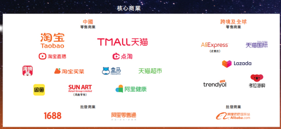 阿里巴巴的业务分为四大块,分别是核心商业、云计算、数字媒体和娱乐以及创新业务。我们先来看看主要业务的核心商业。