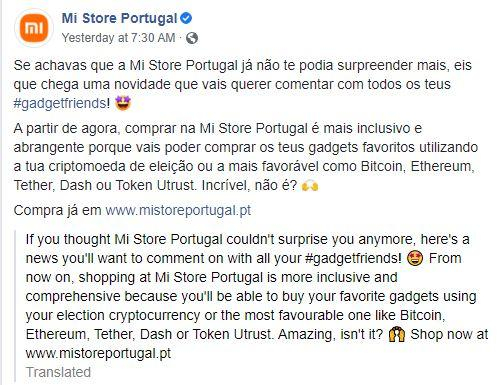 小米葡萄牙商店在社交媒体的官方网页上称,从现在开始,葡萄牙Mi Store的购物体验将变得更加包容和全面,用户可以使用比特币、以太坊、泰达币(Tether)、达世币(Dash)和瑞士加密货币支付服务供应商Utrust开发的原生代币Token Utrust来买小米产品。