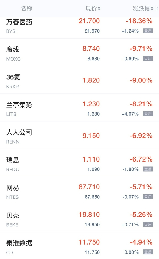 36氪跌超9%,人人公司跌近7%,网易跌近6%,贝壳跌超5%,哔哩哔哩跌超3%,腾讯ADR、爱奇艺、虎牙跌近3%,金山云跌超2%,网易有道跌近2%,陌陌跌超1%,京东、阿里巴巴跌近1%。
