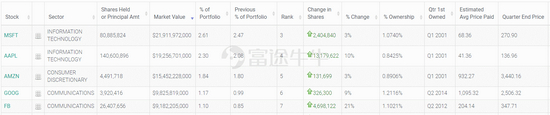 苹果位列第四,持仓1.4亿股,持仓市值192.5亿美元,较上季度持仓数量增加了10%,占投资组合比例为2.3%;Facebook位列第四,持仓2640万股,持仓市值91.8亿美元,较上季度持仓数量增加21%,占投资组合比例为1.1%。