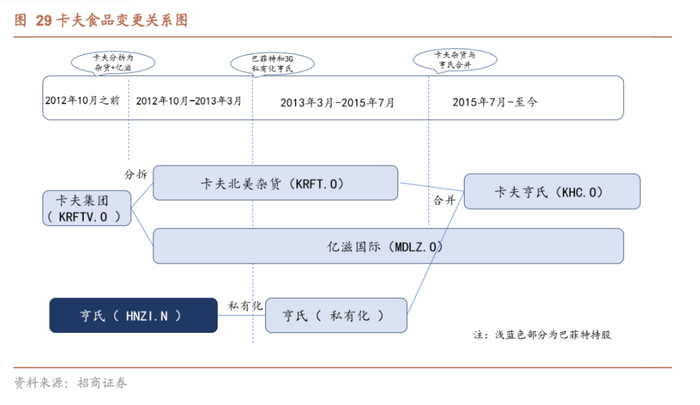 延续3G资本的并购之路。而3G资本赚取的不是外生价值,而是内生的改善价值,这就要求3G资本不断地并购、改善、再并购、再改善,在经营完亨氏后3G资本需要寻找下一个目标——必须是公司品牌不错但是近年增长不强的可改善公司。恰好巴菲特在合并前已经同时持有卡夫北美杂货、亨氏双方的股份,并且相信双方的长期投资价值,选择合并卡夫北美杂货也就成了一个自然而然的选择。