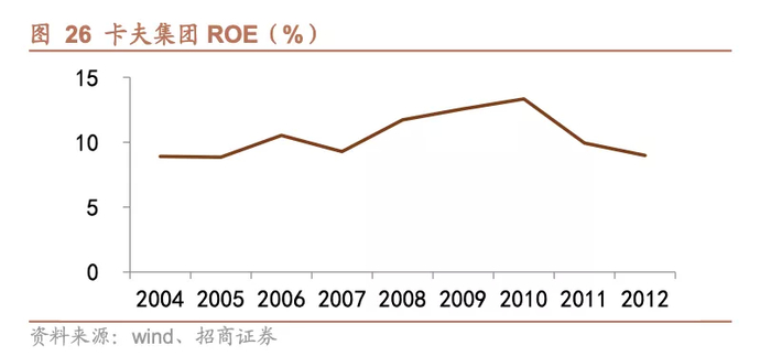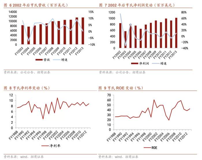 得益于发展新兴市场的战略,公司营收从2002年开启了第二轮增长,从2002年的76亿美元上涨到2013年的115亿美元。净利率在2002年之后基本保持稳定,净利率基本保持在8%以上,ROE的变化主要由杠杆比率变动导致,PE则较为稳定,中枢在15-20X之间。