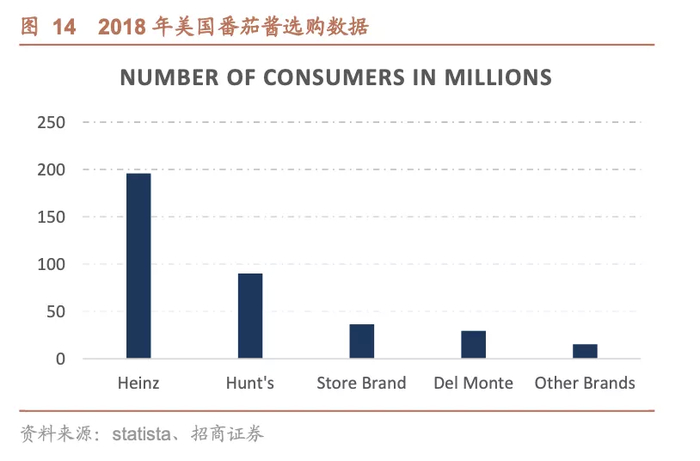 百年品牌长期占领消费者心智。亨氏借助长期的品牌效应,在番茄酱领域铸就了极深的护城河,番茄酱的使用与其他调味品不同,番茄酱是放在餐桌上随时添加的,所以人们可以直观地看到番茄酱品牌的logo,品牌效应直观明显。而亨氏番茄酱借助上百年的历史在美国成为了国民品牌,即使现在各品牌的番茄酱味道差异不大,产品力趋同,消费者还是会倾向于选择熟悉的品牌。据statista调研数据,2018年美国有1.96亿消费者在采购番茄酱时选择亨氏(2018年美国人口总数3.27亿),第二名汉斯番茄酱仅为0.9亿人,仅达到亨氏46%。