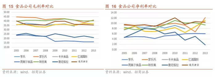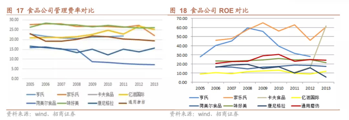 毛利率、净利率中规中矩,ROE极高。亨氏的毛利率在同行业的食品公司中属于居中水平,家乐氏、通用磨坊和味好美的毛利率领先。尽管管理费率不算高,但净利率仍然在中游。值得一提的是亨氏的ROE指标较为突出,仅次于家乐氏,排在第二。