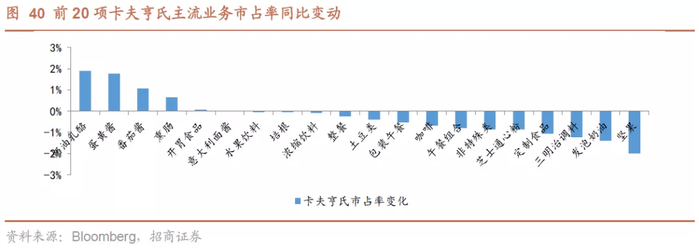 自有品牌挤占份额,市占率此消彼长。卡夫亨氏的主流业务增速不敌自有品牌,市占率自然也就此消彼长。在2018年4月-2019年4月间,卡夫亨氏前20项细分业务仅有6项业务的市占率呈现同比上市,14项均同比下滑。与此相对的是自有品牌的蒸蒸日上,其中有16项呈现同比上升,仅4项下滑。事实上,在这20项主流业务赛道中,不仅是卡夫亨氏受到了自有品牌的冲击,其他品牌同样有14项业务呈现同比下滑态势。自有品牌挤占了卡夫亨氏在主流市场的主流业务份额,最终导致公司收入增长出现颓势。