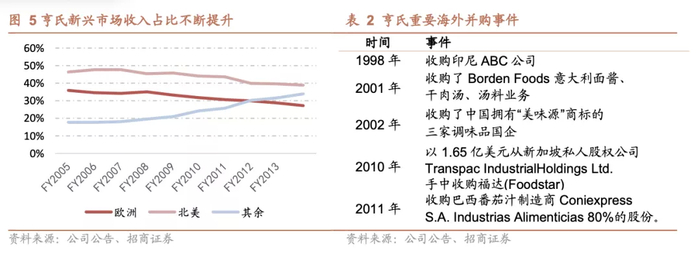 二十一世纪亨氏将抢占新兴市场作为战略目标,在这些地区的并购案显著增多,典型地包括收购印尼ABC公司进入印尼罐头、调料市场,收购中国福达公司旗下的味极鲜品牌及广合腐乳品牌,收购巴西的番茄酱制造商Coniexpress等。这期间北美、欧洲营收占比不断下降,新兴市场收入成为重要的增长动能。亨氏通过全球设厂,实现生产本土化,同时收购当地品牌,进行品类与地域的扩张。亨氏在欧洲、亚太、拉美、中东、非洲等地区拥有了41座工厂和四十多个及商标使用权。