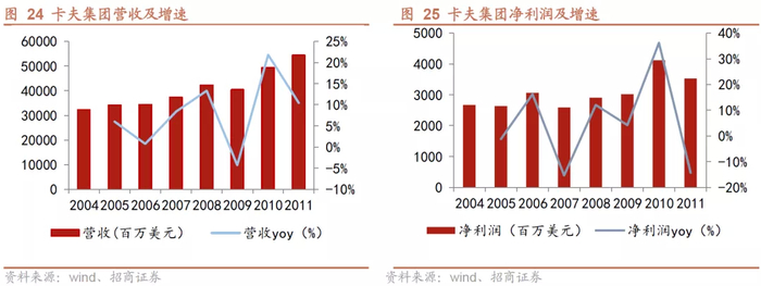 受益于加码营销投入(主要投放于媒体广告)和不良品牌剥离,卡夫集团营业收入基本保持上涨趋势,从2004年321亿美元上涨到2011年的544亿美元,7年间CAGR达到7.8%。公司净利润在30亿美元上下波动,其中2010年较高,超过40亿美元,系受益吉百利销售额提振(2010Q1 公司收购吉百利,成为全球最大糖果商)。