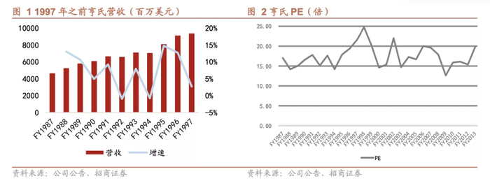 二战后,亨氏公司借西方各国经济重建之机,开展全球性的扩张行动。公司先后在荷兰、日本、意大利、葡萄牙、法国、联邦德国、委内瑞拉等国兴办子公司,并陆续收购雷默兄弟、Ore-Ida和StarkistTuna等公司。截至1959年,亨氏来自海外的收入已占总收入的40%。得益于美国经济的持续发展以及亨氏的全球扩张(主要在西方),人口的增长及人均调味料使用上升均带来番茄酱消费量的提升,公司在1997年前营收经历了一轮增长,从1987年的46亿美元上涨到1997年94亿美元。估值方面受到业绩刺激,叠加1997Q4股票回购拉动,在1997年达到25倍的峰值。