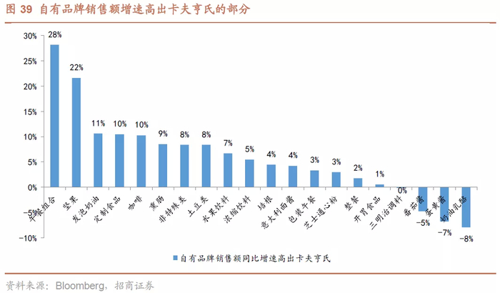 主流业务增速不及自有品牌。公司在美国市场下跌的份额主要是被自有品牌挤占,根据尼尔森报告,在2018年4月至2019年4月间的美国市场,公司占比位于前20名的业务类别中,其中有16项细分业务的销售额增速没有跑赢自有品牌,仅4项细分业务增速超过自有品牌,分别是番茄酱、蛋黄酱、奶油乳酪、三明治调料。其中番茄酱、蛋黄酱、 奶油乳酪是公司的强品牌力产品,尤其是番茄酱具备亨氏品牌的护城河保护,在自有品牌冲击下仍能保持优势地位。但公司其他缺乏品牌力的产品在面对自有品牌时表现乏力,受冲击更大,其中差距最大的是午餐组合,其增速被自有品牌增速超出28个百分点。