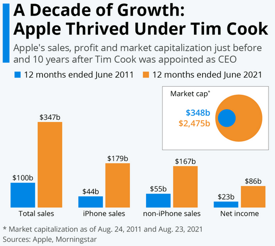 库克在正式接任苹果公司CEO之前一直是代理CEO,但他上任前的季度与当前销售额之间的差异凸显了苹果公司的规模扩大了多少。