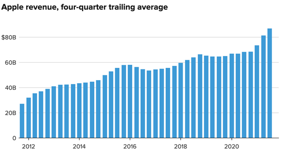 2011年第三财季,苹果公司报告的收入为285.7亿美元。今年,在同一季度和最近一个有数据可用的季度,苹果公司报告的收入为814亿美元——几乎是当年的三倍。